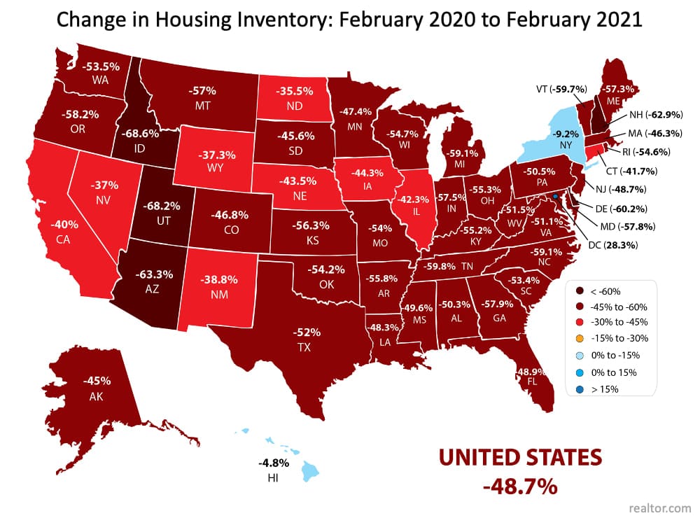 “Total active inventory continues to decline, dropping 50 percent. With buyers active in the market and sellers still slow to put homes up for sale, homes are selling quickly and the total number actively available for sale at any point in time continues to decline.” (See map below):